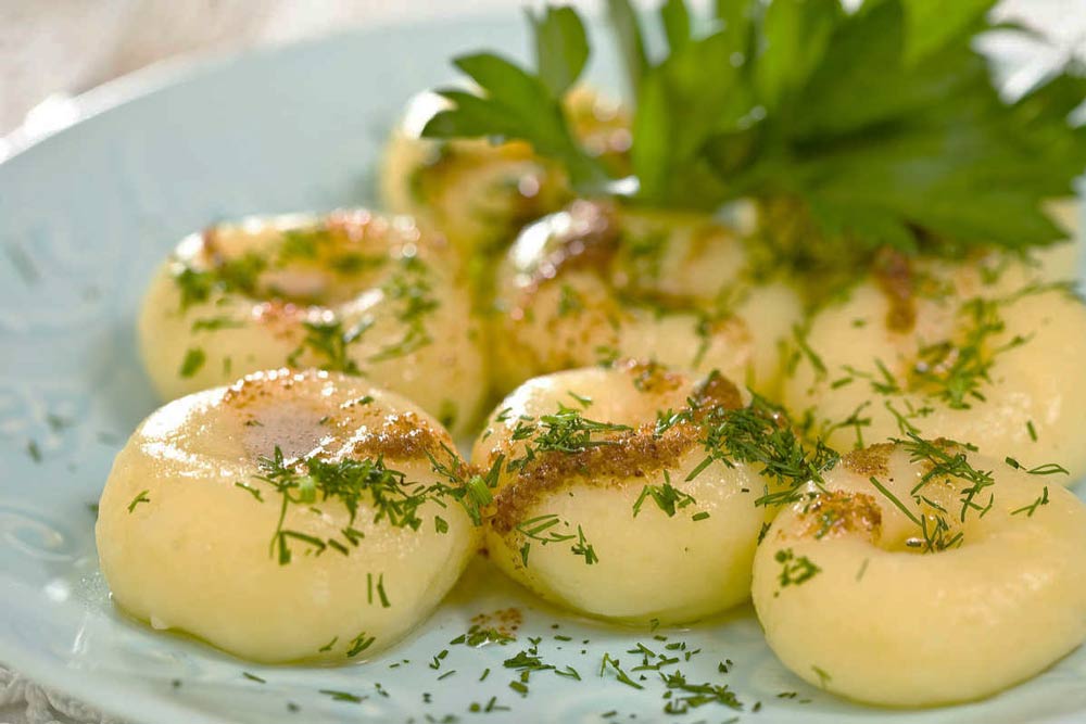 Клецки – шарики из натертого на мелкую терку картофеля и лука с яйцом и небольшим количеством муки. Отвариваются в воде, подаются со сметаной и зеленью.