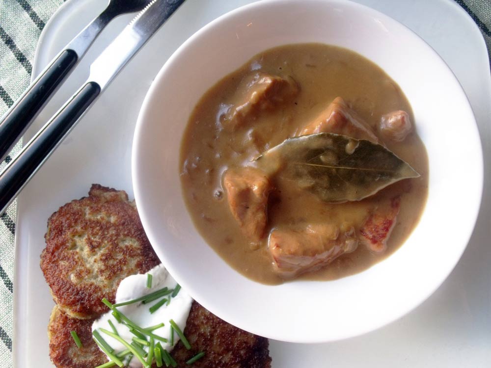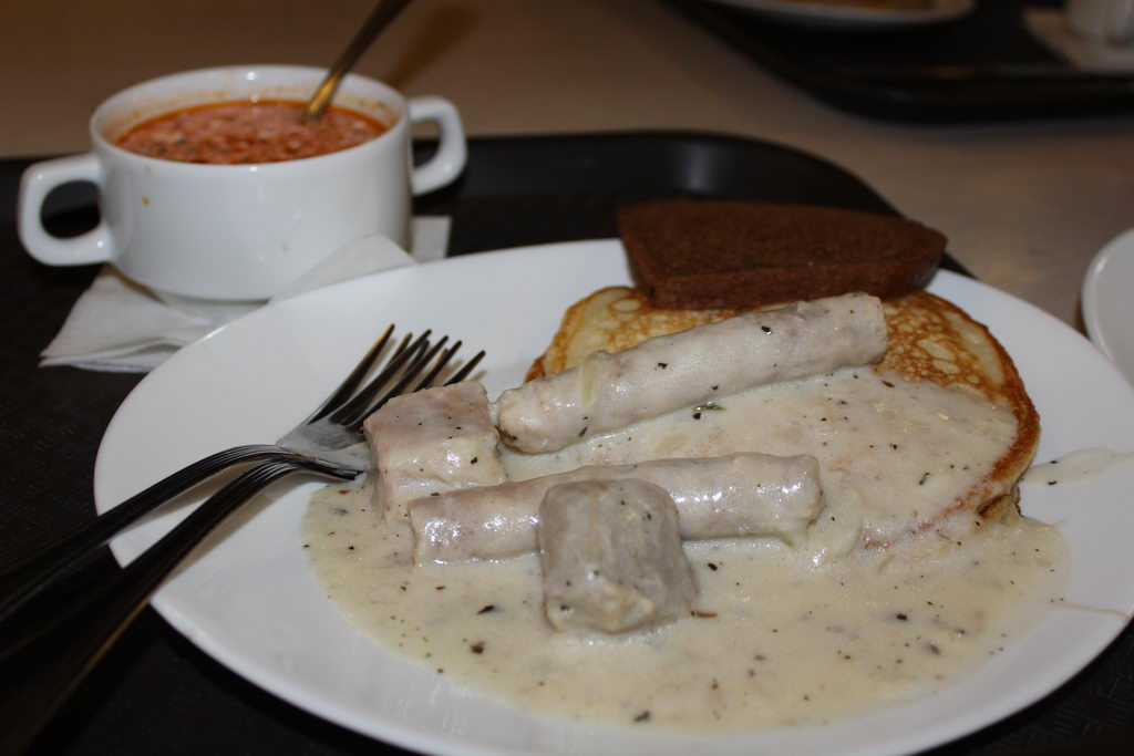 Мачанка с блинами – 5 белорусских рублей (158 русских руб). Мачанка (макать) состояла из разного рода мяса и мясных сосисок под густым мясным соусом.