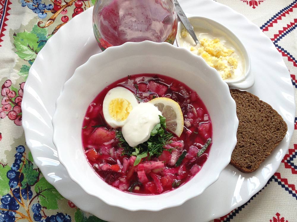 Свекольник – холодный суп, в состав которого входят отварная свекла, отварные яйца, огурцы, укроп и редис. Все заливается свекольным отваром. Очень приятное блюдо в жаркий летний день!
