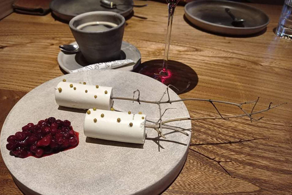 Сливочный мусс с черным перцем, начинкой из яблок, карамелизированными грецкими орехами и брусничным соусом — самый инстаграмный десерт
