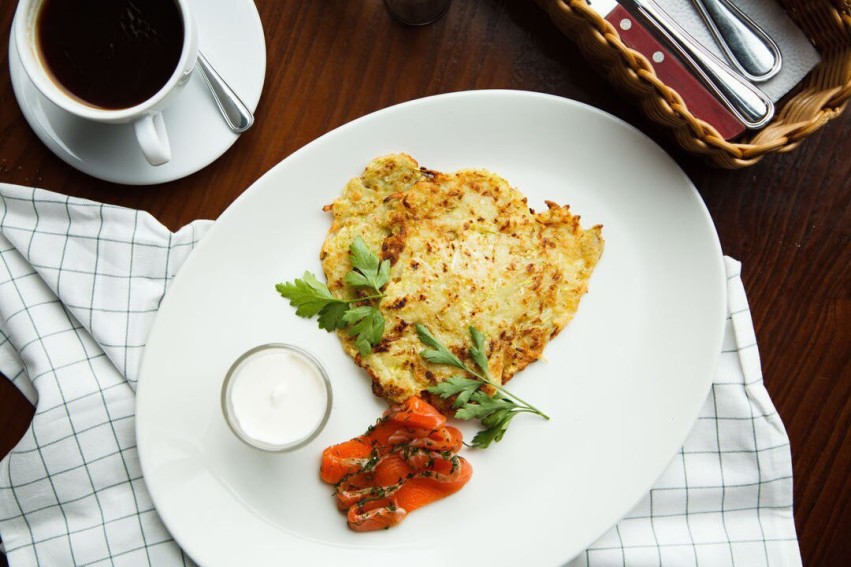 Британский завтрак с поджаренными колбасками, беконом, глазуньей, кучей овощей-гриль, чиабаттой и фасолью обойдется невегетарианцу в 330 рублей, блинчики с домашним вареньем – 145. Оладьи из цукини с семгой и сметаной – 255, а кашу можно выбрать еще и овсяную, и рисовую, за те же 80.