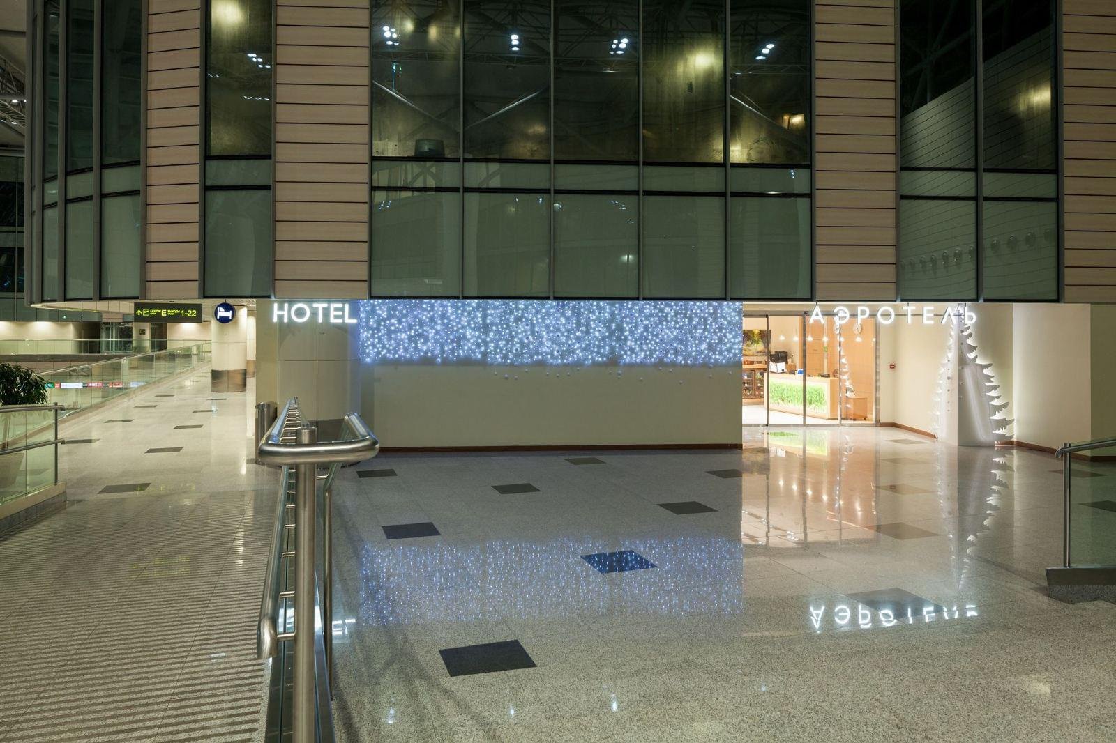 В 500 метрах от терминала аэропорта «Домодедово» расположен современный гостиничный комплекс «Аэротель». В нем предусмотрен бесплатный трансфер от третьего выхода. Он круглосуточно отправляется каждые 15 минут.