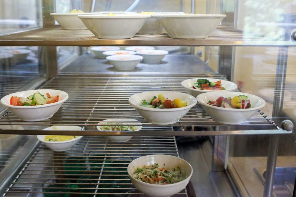 Сразу за кассами увидите стопку подносов. Выбор блюд начинается с салатов.