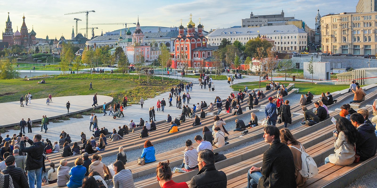 С верхних рядов амфитеатра или парящего моста в парке «Зарядье» можно увидеть собор Василия Блаженного, Спасскую башню, колокольню Ивана Великого, торговые ряды… Насладиться видами можно по понедельникам с 14:00 до 22:00 (вход до 21:00), а также по другим дням с 10:00 до 22:00 (вход до 21:00). Особенно красиво в «Зарядье» летом, когда Кремль утопает в зелени и лучах заходящего солнца.
