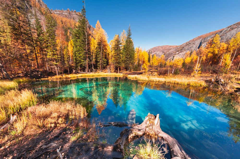 Увидеть окантованное золотой листвой Телецкое озеро — крупнейшее в Горном Алтае — удобнее всего с катера, по дороге вам встретятся несколько водопадов и остров Любви. Если доберётесь до Улаганского района, обязательно посетите Гейзеровое озеро удивительного бирюзового цвета.