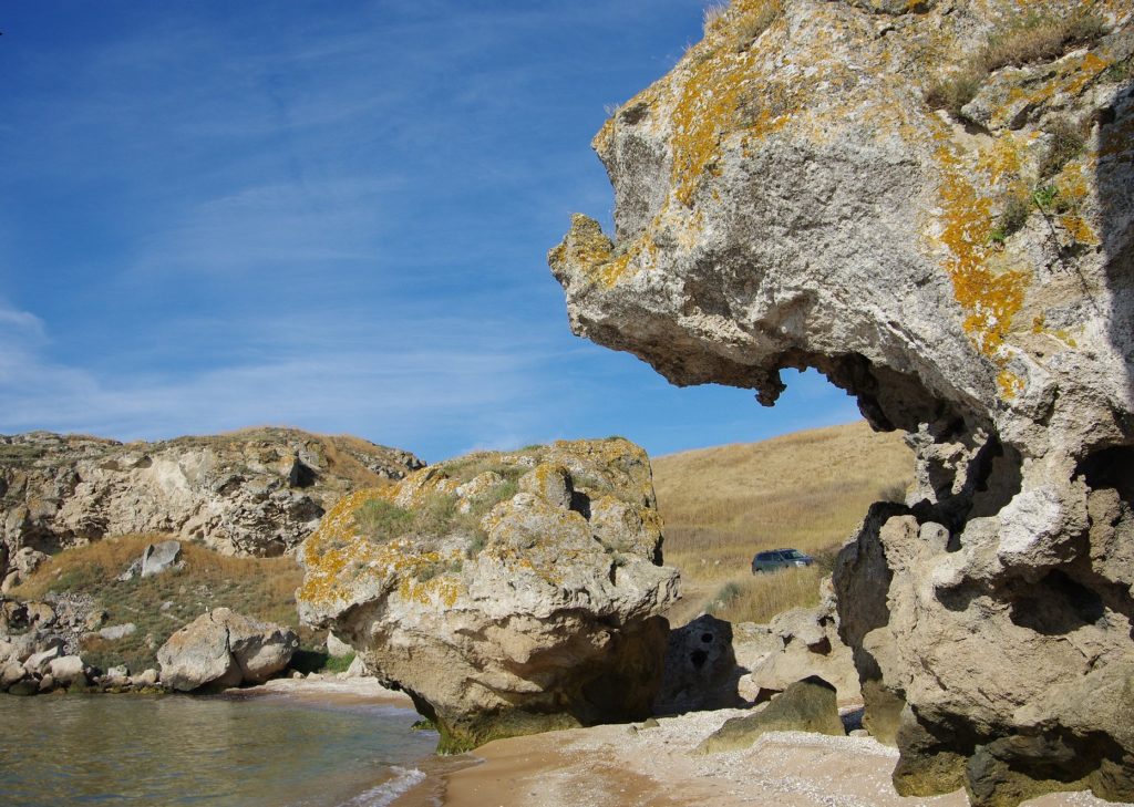 - Стоянка 45°28′28″N 36°14′54″E. Пляж, разделенный на две половины скалой, уходящей в море. Машину можно оставить практически на берегу.