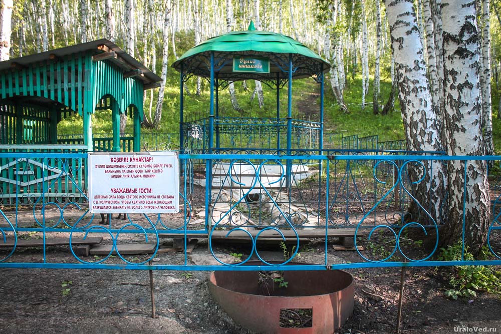 За оградой построены беседка и колодец, из которого вытекает вода. Она немного мутновата, но приятная на вкус. Источник действует только несколько недель весной – в мае. Вода источника считается священной, она якобы избавляет от болезней. Весной сюда съезжаются тысячи людей (и не только из Башкирии), образуются очереди за водой.