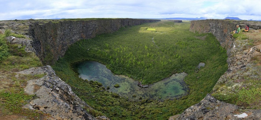 Каньон длиной 3,5 км и шириной около 1 км разрезан надвое похожей на башню скалой, с которой открывается фантастический вид, а внизу можно побродить по густым зарослям невысоких исландских деревьев: березы, ивы, ели, лиственницы и сосны.