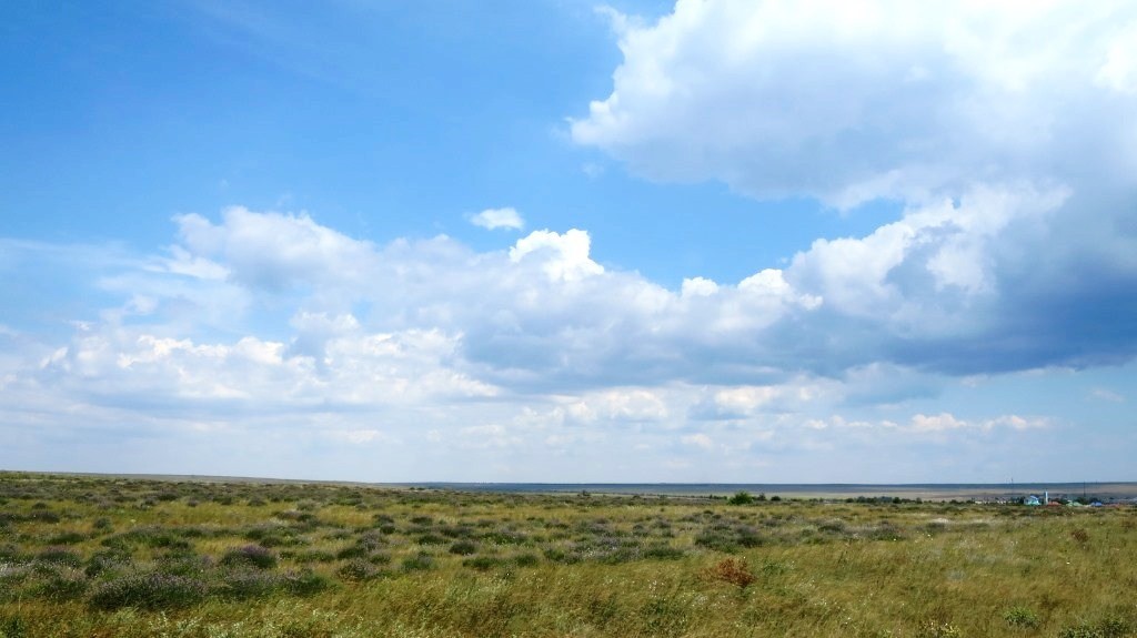 Добрались до обрыва и были впечатлены резким контрастом между почти сухой тусклой степью и необычайно ярким морем.