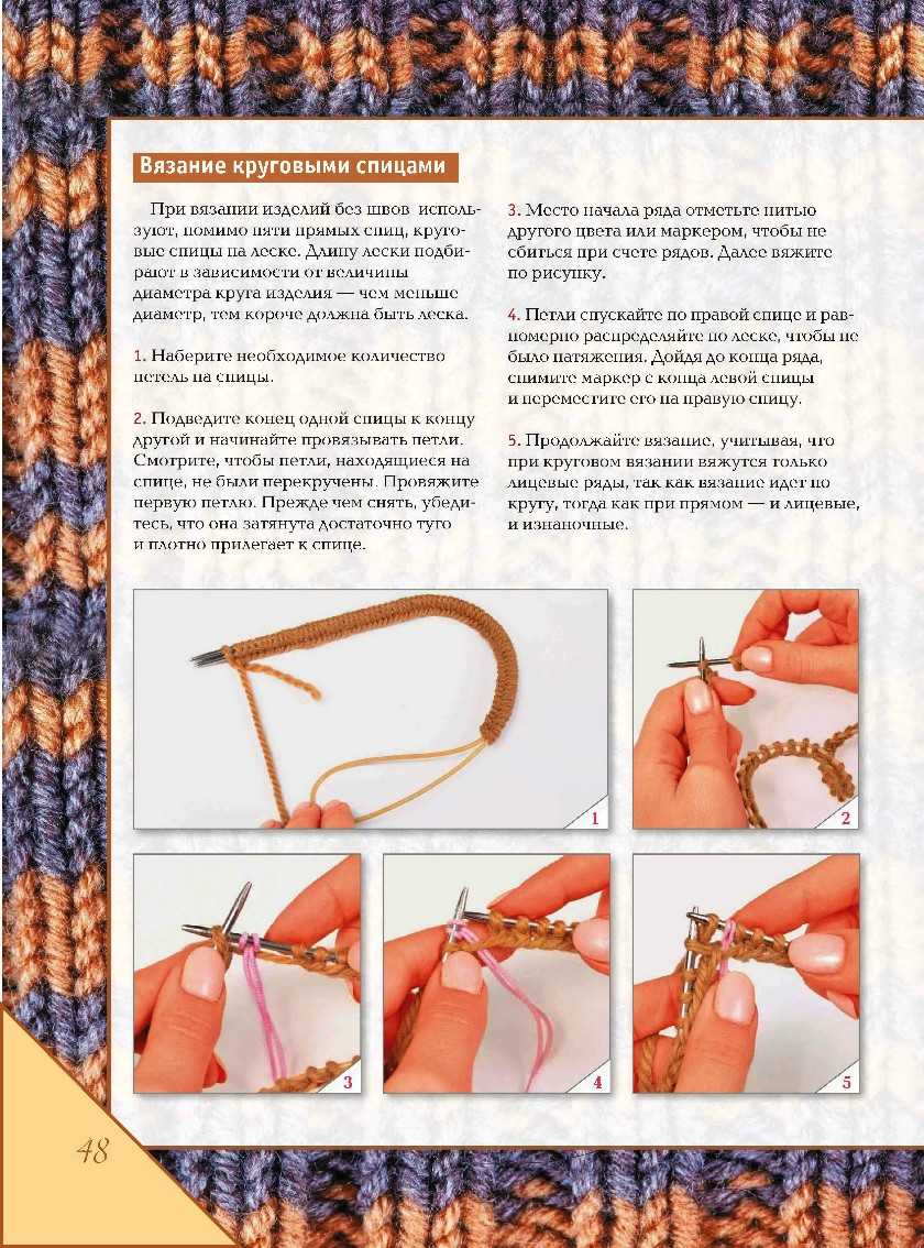 Чтобы вязать по кругу, надо использовать лицевую гладь в каждом ряду. Выбирая рисунок, нужно уточнить, может ли он быть выполнен спицами кругового типа. При вязании кругового шарфа или какого-либо иного изделия требуется время от времени проверять количество петель.