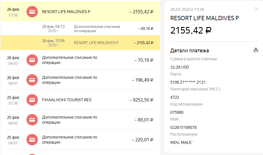 Неприятный момент здесь — дополнительное списание по операции. Это из-за того, что курс рубля просел за пару дней, пока платеж обрабатывался банком.