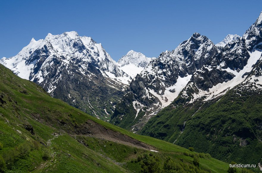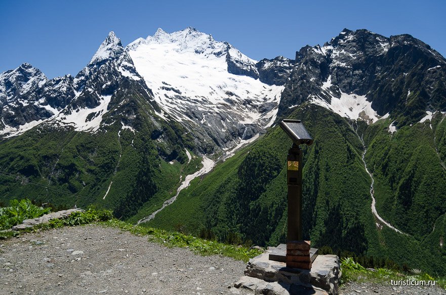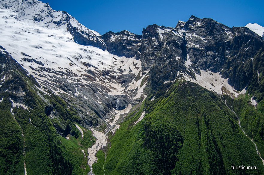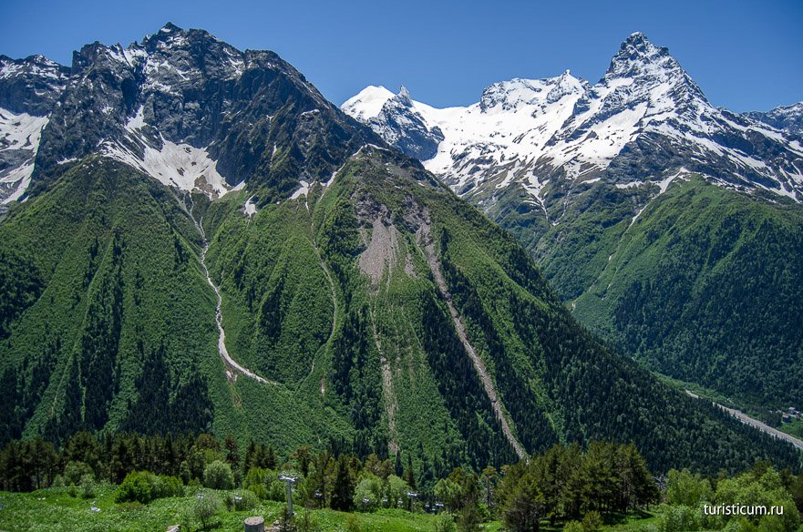 Если посмотреть еще левее, то тут уже видна гора Домбай-Ульген. Высота пика 4046 метров. С карачаевского языка словосочетание «домбай ульген» переводится как «убитый зубр». По иронии судьбы гора была так названа задолго до истребления последнего зубра в регионе. На фото гора Домбай-Ульген слева.