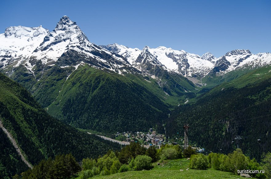 Внизу виден поселок Домбай. А перед нами горы. Слева направо Зуб Суфруджу высота которого 3600 метров, Белалакая, Алибекское ущелье и гора Аксаут.