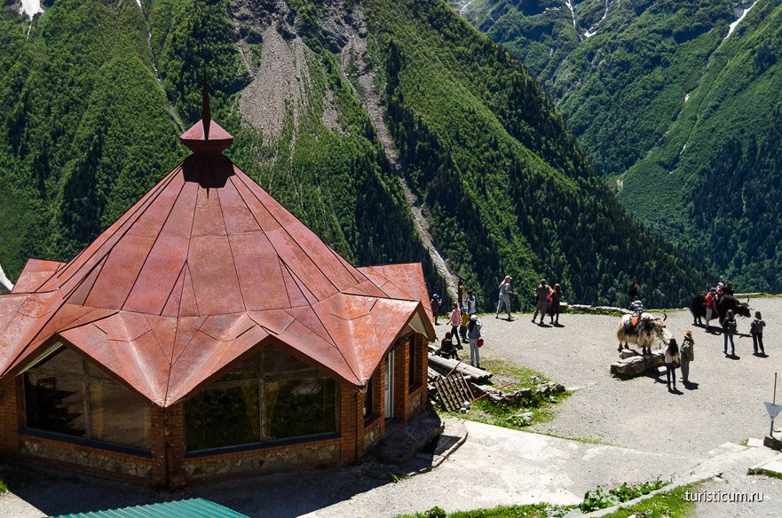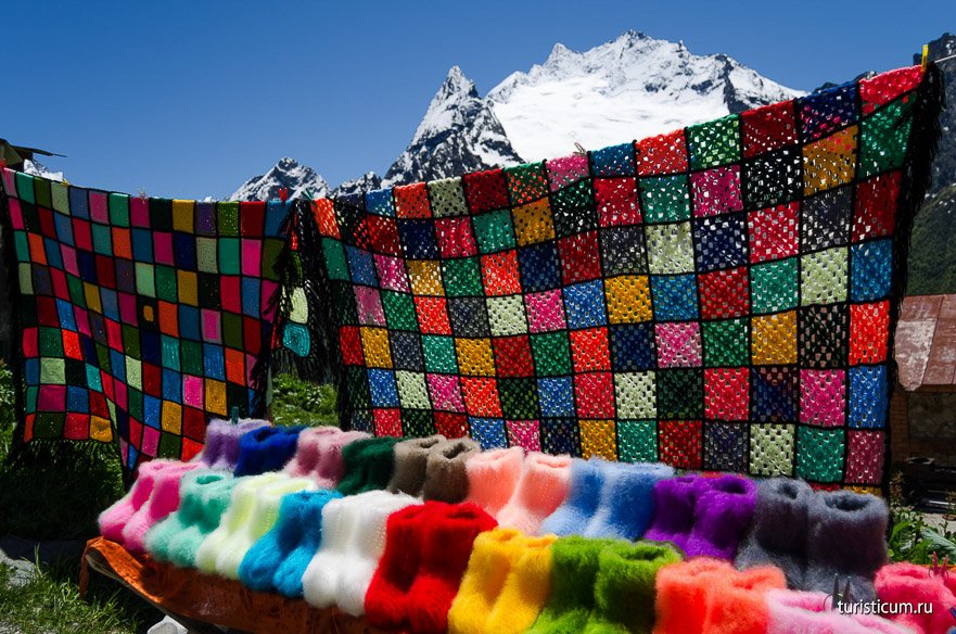 Здесь, как и в поселке Домбай, находится рынок, где можно купить все что произведено местными жителями и выросло на склонах гор: травяные сборы, мед, варенье, орехи, вязанные вещи, овечьи шкуры и многое другое. Цены совершенно не отличаются внизу и наверху. Кроме рынка здесь находится несколько кафе, где можно вкусно покушать.