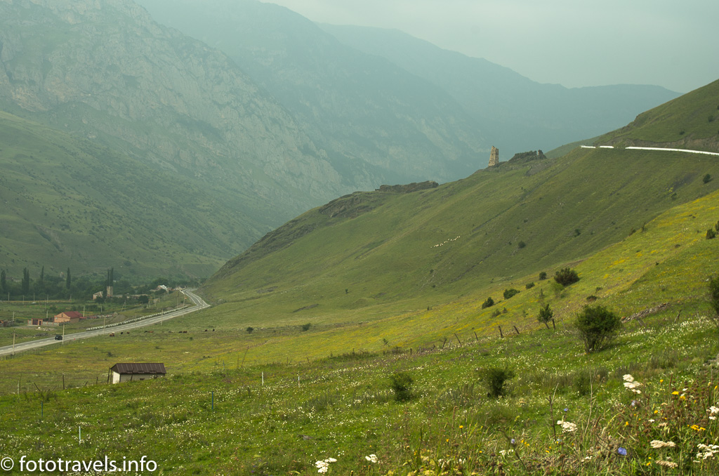 Обозначенный маршрут до Архонской почти ничем не примечателен, кроме пары асфальтовых серпантинов и нескольких сторожевых башен где-то вдалеке. В целом, больше похоже на Ставропольский край, чем на Кавказ. Интересного мало.