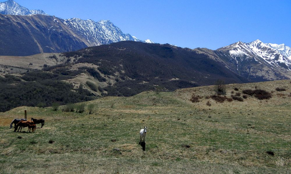 Кажется, что склоны гор покрыли зеленым ковром, местами пустили тонкие струйки дорог. Здесь же можно встретить в большом количестве пасечников с ульями и отменным медом.