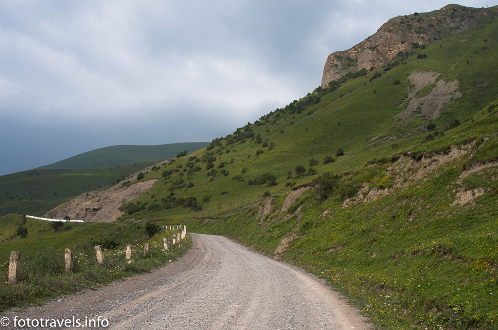 Погуляв по долине, разворачиваемся и едем обратно. Сразу за селом Борзикау поворачиваем направо, где начинается уже настоящий горный серпантин. Дорога не асфальтирована, но хорошо укатана и для проезда вполне пригодна. Окружающий пейзаж здесь впечатляет еще больше.