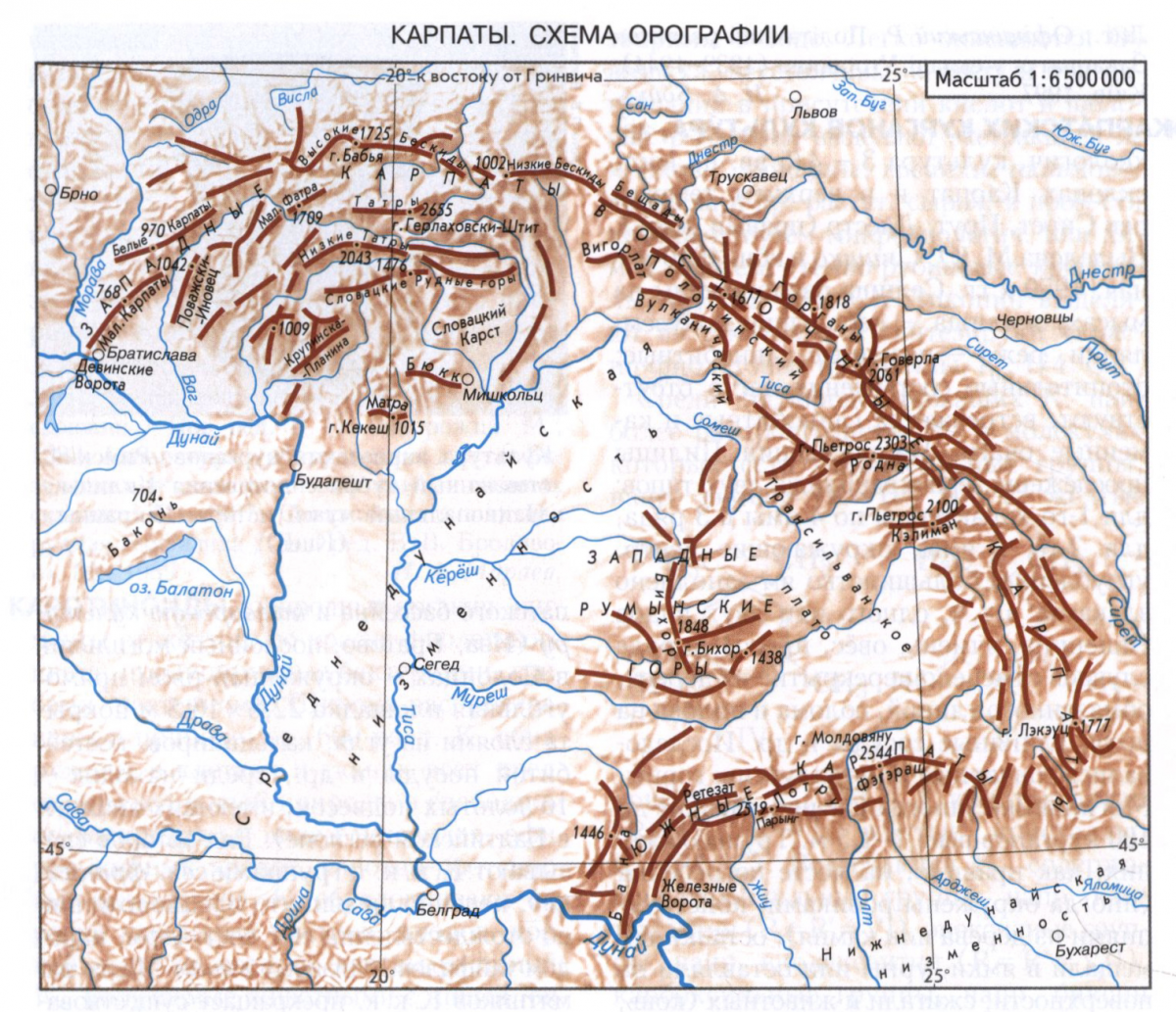 Орографически они делятся на Западные Карпаты (с юго-западным отрогом Малые Карпаты, высота до 768 м), Восточные Карпаты и Южные Карпаты; северные хребты Западных и частично Восточных Карпат образуют Бескиды.