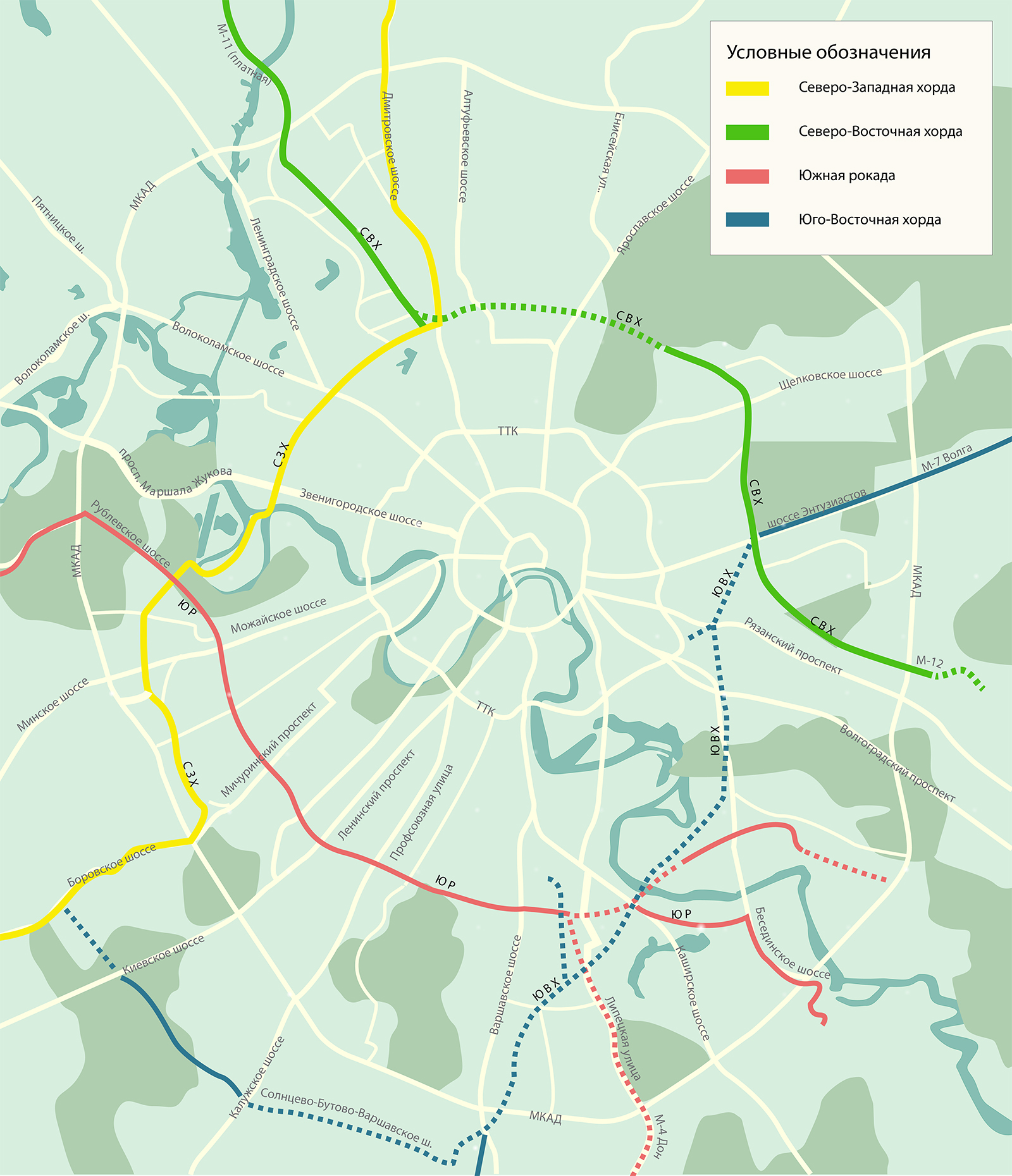 В Москве строят три большие диагональные трассы в обход центральных районов: Северо-Восточную и Юго-Восточную хорды и Южную рокаду. Уже построена Северо-Западная хорда – магистраль длиной 83 км, которая проходит от Сколковского до Ярославского шоссе и связывает четыре округа столицы: Западный, Северо-Западный, Северный и Северо-Восточный.