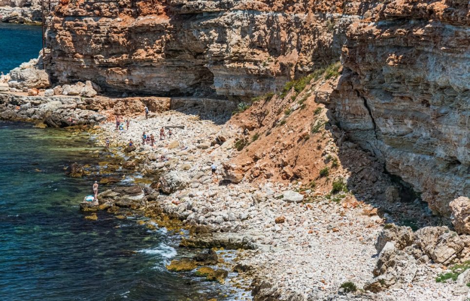 Чтобы подойти к морю, здесь нужно пробраться по крутым обрывам и скалам. И в воде, и на берегу лежат крупные валуны. Такие «спартанские» условия привлекают не слишком много желающих. Поэтому здесь часто останавливаются предпочитающие уединенный отдых нудисты. На наиболее оборудованном из здешних пляжей есть бетонные ступени, ведущие в море. Кроме того, на пирсах закреплены лесенки для того, чтобы спуститься в воду и выбраться потом из нее