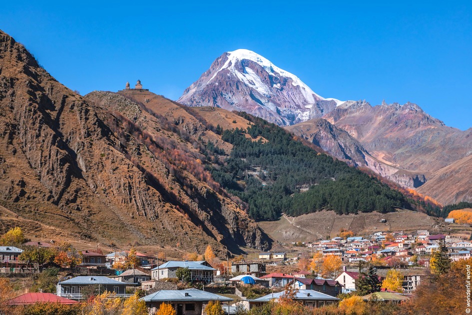 Казбеги — это муниципалитет, расположенный в регионе Мцхета-Мтианети на востоке Грузии, на историческом территории Хеви. Он был заселен с древних времен. Здесь есть обнаруженный Казбекское сокровище, датированный старого летосчисление VI-V веками, который связано с религиозным культом древних кавказских племен. Природа Казбеги прекрасна. Горы, скалы, водопады и альпийские озера привлекают множество туристов, путешественников и любителей горных видов спорта. Здесь отмечается много праздников (Атенгеноба, Спатангелозоба, Казбегоба, Гергетоба и др.), где можно познакомится обрядом Хеви и местной кухни.