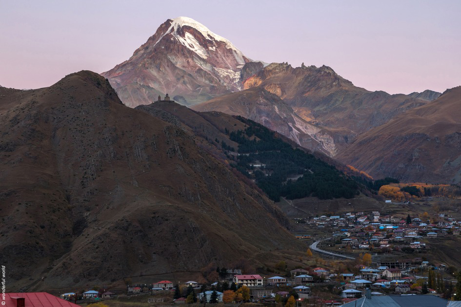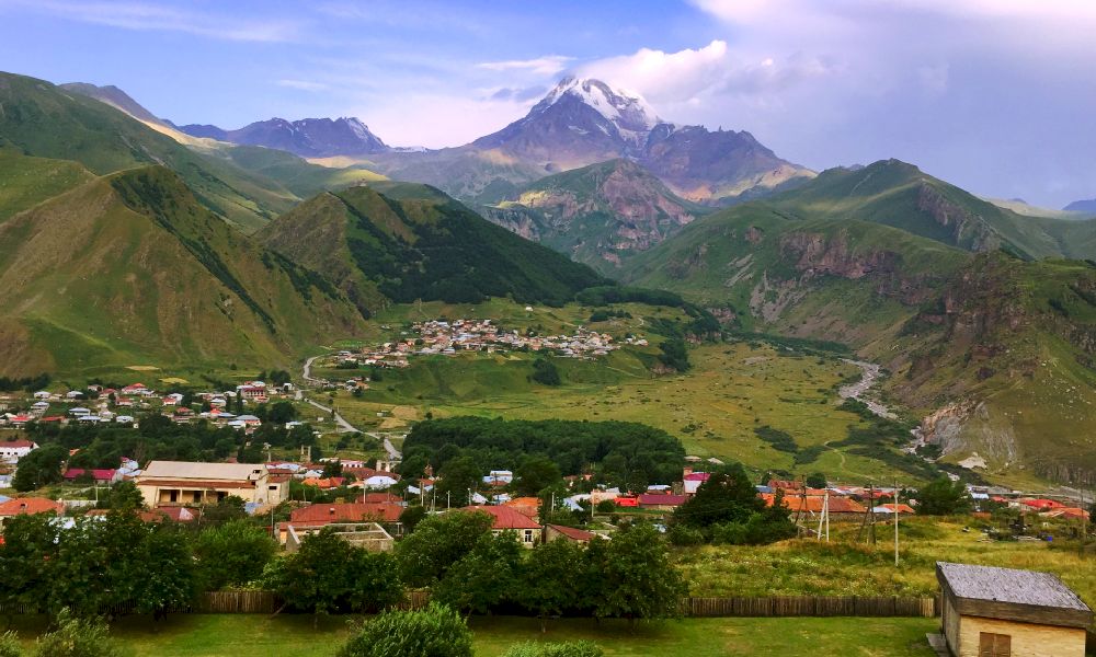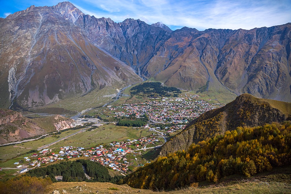 Степанцминда — довольно крупный поселок, или даже небольшой городок, расположенный у подножия горы Казбек на высоте 1700-1800 метров над уровнем моря. Со всех сторон Степанцминду окружают прекрасные и величественные горы.