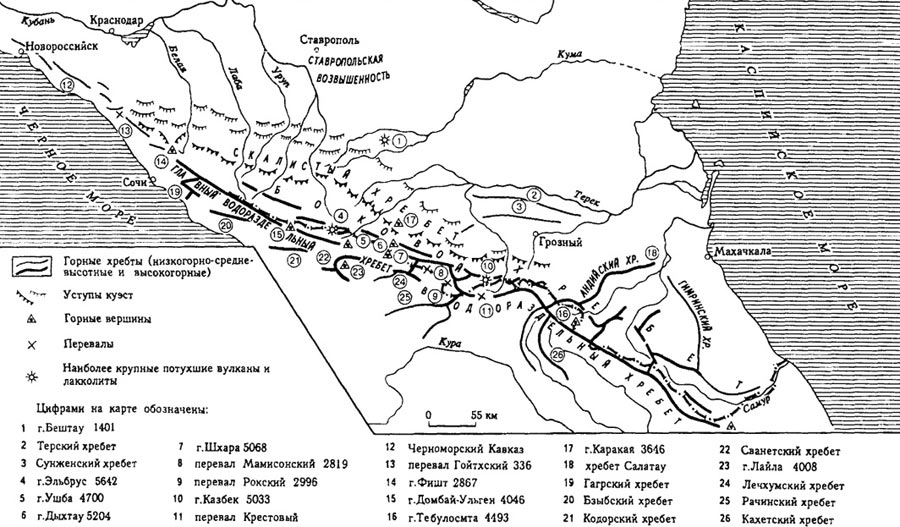 Северная часть водораздела украшена поперечными котловинами. А южная — продольными. Кавказский хребет характеризуется тем, что у многих вершин основой является не Водораздельный хребет, а оконечности коротких его отрогов, направленных в сторону севера. Такой вершиной, к примеру, является Эльбрус (высота 5642 м).