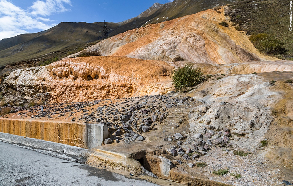 Это место сложно пропустить, склон ярко-рыжего цвета привлекает внимание; здесь останавливаются машины и экскурсионные автобусы, туристы фотографируются на фоне скал, порыжевших от стекающей по ним минеральной воды, набирают воду в бутылки. (Но вообще-то минеральную воду лучше пить сразу, прямо из источника, потому что в бутылке она быстро окисляется и теряет свои полезные свойства.)