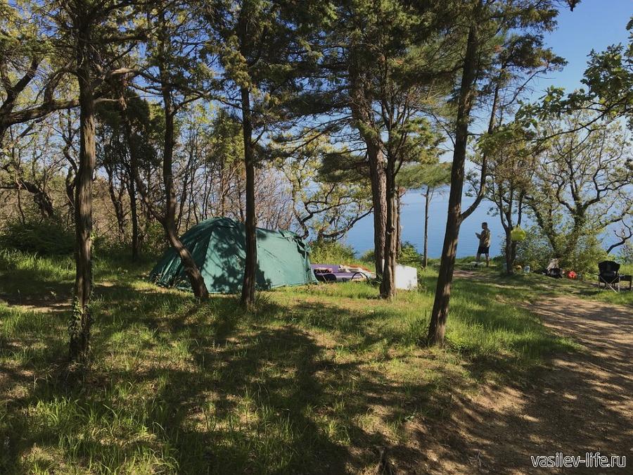 Кемпинг расположился в тени раскидистых деревьев, всего в 50 метрах от благоустроенного пляжа с пологим входом. На Черноморском побережье созданы отличные условия для активного времяпровождения. В стоимость размещения с палаткой входит пользование: душевыми с горячей водой, туалетами (централизованная канализация), умывальники, столы со стульями. А также зона отдыха с мангалом, освещение у палаток. Зарядить гаджет или воспользоваться полкой в холодильнике можно за дополнительную плату.