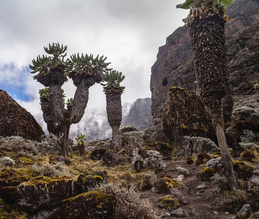 Вересковые луга – 2800–4000 м. На этой высоте склоны Килиманджаро окутывают густые туманы, поэтому растения насыщаются влагой, что дает им возможность произрастать в таком сухом климате. Здесь встречаются плантации эвкалипта, кипарисов, а местные жители поднимаются на склон для выращивания овощей в тенистых участках. Туристы имеют возможность посмотреть на поля, где растет лобелия ланурийская, достигающая в высоту 10 м. Встречается и крестовник, но не обычный, а гигантский. Чтобы лучше понять масштабы и красоту могущественного леса, стоит посмотреть фото туристов. Пористая почва, насыщенная кислородом, позволяет произрастать большому количеству зерновых культур.