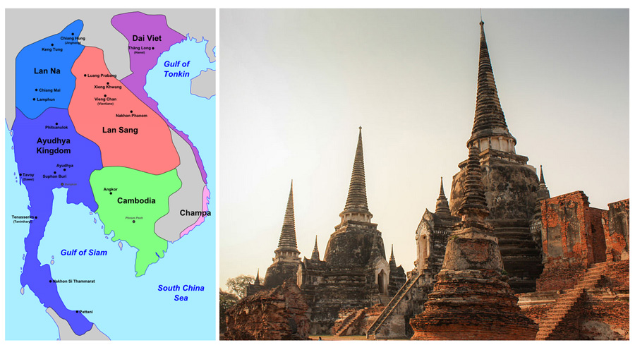 Париж был деревней в то время, когда о силе и богатстве Аюттхая слагались легенды. Новая столица королевства Сиам (прежнее название Таиланда) была основана в 1350 году королем Рамадхипати I. Хотя кхмеры были «наследственным» врагом и бушевали войны, Аюттхая перенял их язык и традиции. Одним из побочных эффектов заимствования элементов вражеской культуры, стало поклонение тайским королям, как божеству. Но, как ни странно, это вдохновляло народ и армию. В ходе безжалостных битв кхмерская столица Ангкор пала в 1431 году.