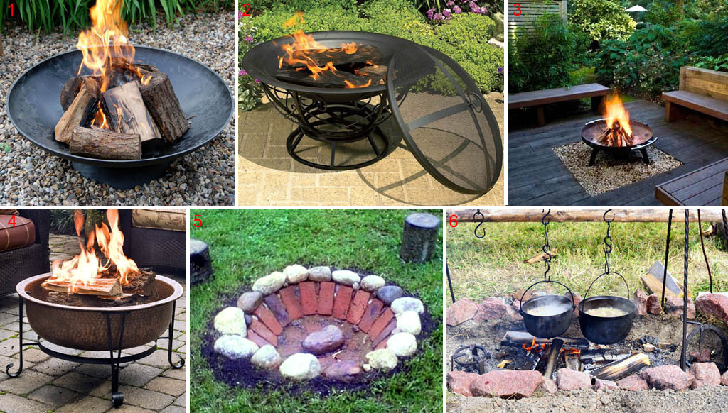 Чугунные чаши для костров есть в продаже, от простых до дорогущих. Декоративные костры в чашах в некоторых странах разрешено разводить на несгораемой подложке среди деревянных предметов (поз. 1-3 на рис.), но не в деревянных строениях. Красивую чашу для костра можно сделать и своими руками из негодного таза (поз. 4), выкрашенного жаростойкой эмалью; на дно посуды (возможно, прохудившейся) насыпают ок. 10 см гравия или керамзита, а поверх – песок.