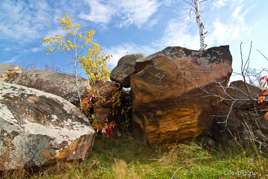 От Конь-камня едем через село Козье и на развилке внутри деревни поворачиваем направо. Доезжаем до Красногорского и прямо перед ним уходим налево вдоль домов. Там камни и увидите.