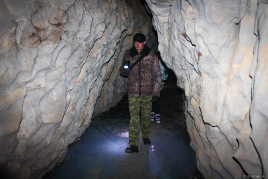 Стены пещеры имеют красивый ребристый рельеф – это следы воздействия потоков воды. Общая длина пещеры достигает 1660 м. Она находится около посёлка Сказ Нязепетровского района Челябинской области.