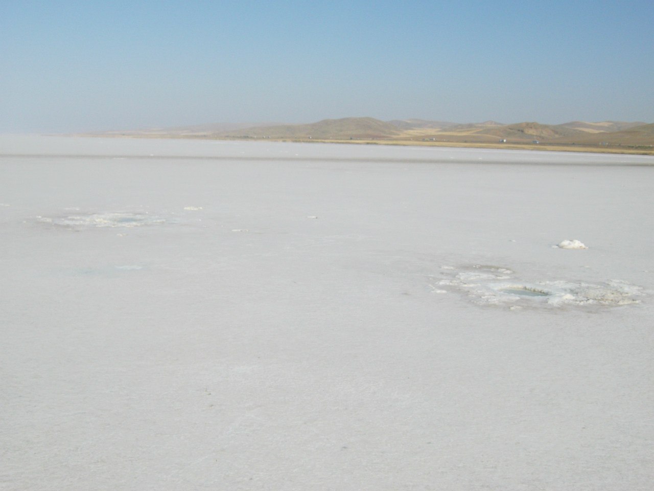 На озере Туз пытался я дойти до начала воды, прошёл около 1 км, но так и не дошёл до воды, сплошное царство соли. На снимке некие лунки, в коих, возможно, турецкие рыбаки пытались ловить рыбу в воде (в соляном растворе), и, похоже, ничего не поймали.