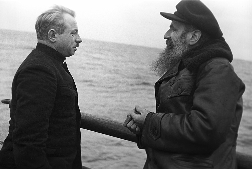 Начальник дрейфующей станции «Северный полюс – 1» Иван Дмитриевич Папанин и Герой Советского Союза, действительный член Академии наук СССР, начальник Главного управления Северного морского пути Отто Юльевич Шмидт (слева направо) на ледоколе «Ермак».