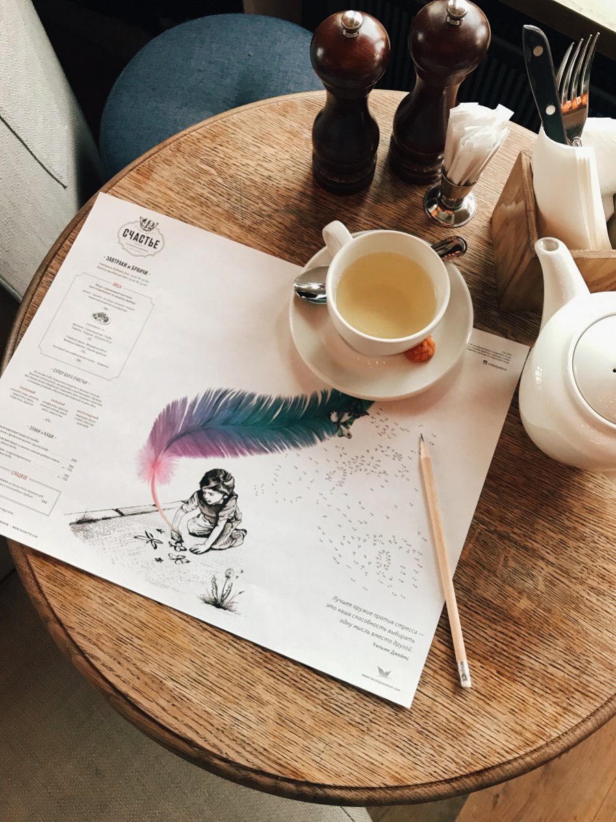 Кафе с видом на Исаакиевский собор. Уютный и нарядный интерьер, необычные сочетания в еде. Каждому выдают бумажную скатерть, на которой нужно соединять точки, чтобы получилась картина.
