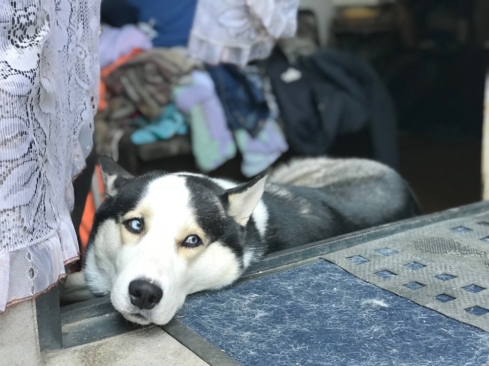 По разным сторонам этой улицы простые жилые дома, где гостеприимные грузины даже не закрывают входные двери. В одном из таких домой мы обнаружили шикарного пса породы хаски.
