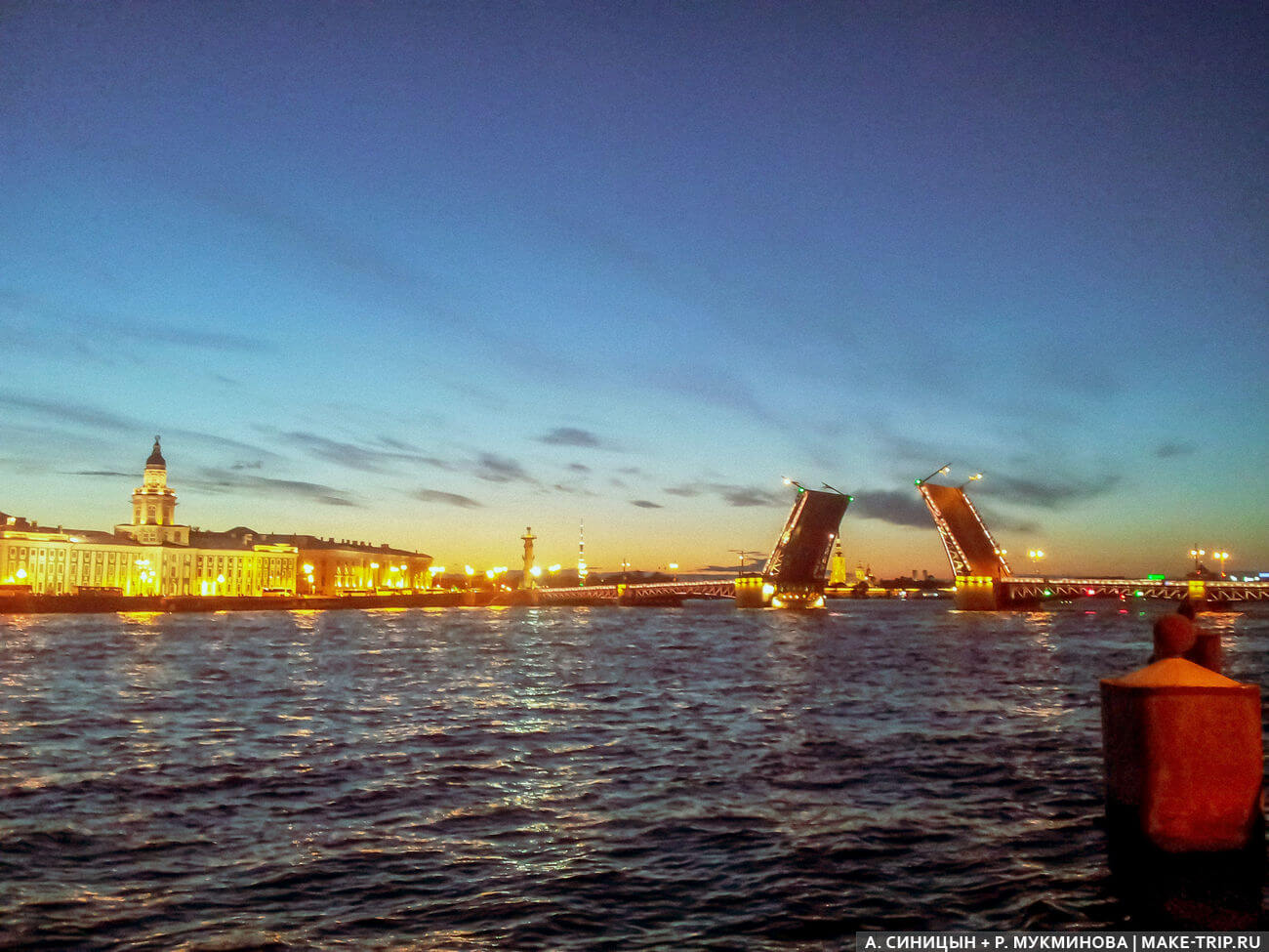 Особенной популярностью пользуются ночные прогулки с наблюдением за разводкой мостов и прохождением под поднятыми пролетами мостов. Обычно в программу входит наблюдение за разводкой Дворцового и Троицкого мостов. На некоторых теплоходах организуется живая музыка и еда. Не забудьте взять с собой теплую одежду, на реке бывает ветрено и прохладно, на некоторых теплоходах выдают пледы.
