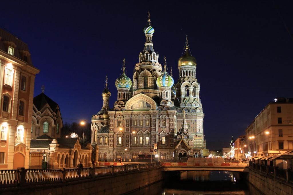 По пути к Дворцовой площади туристам выпадает шанс полюбоваться подсвеченным храмом Спаса на Крови, расположенным на канале Грибоедова. Здание, впечатляющее днем, становится еще более грандиозным в свете ночных огней.