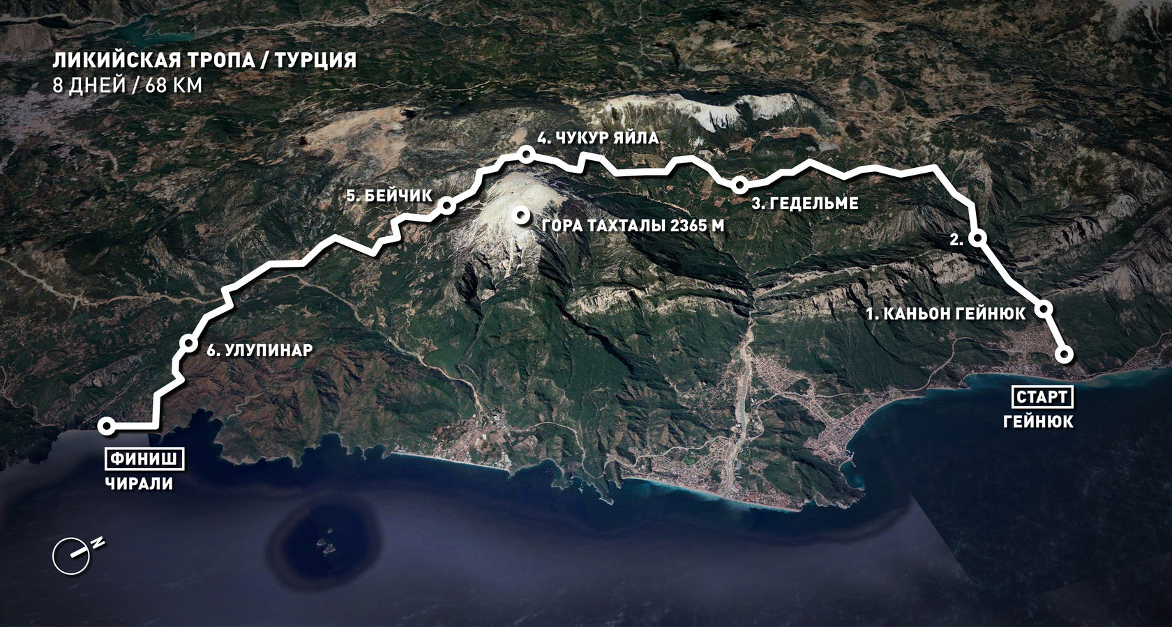 Восточный маршрут: Гейнюк, гора Тахталы (2365 м), Бейчик, Чиралы, Адрасан, мыс Гелидония, Караоз. На Восточном маршруте не обойтись без палатки, придется нести с собой еду, разводить костер для приготовления пищи. К тому же это высокогорный маршрут и зимой на пути может лежать снег — оставьте его на теплые месяцы года.