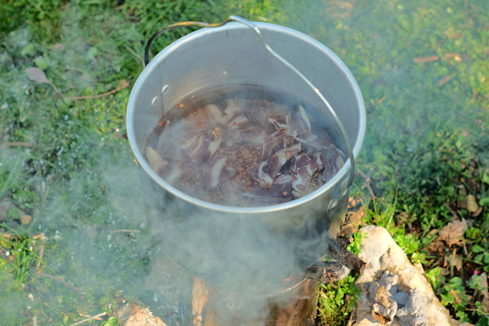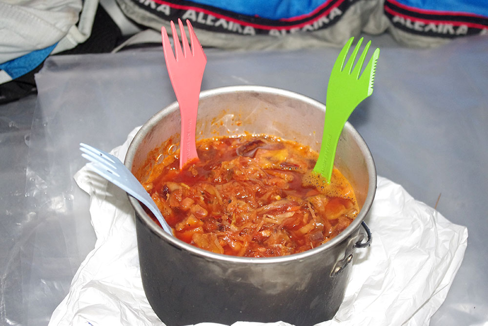 Дождь дал нам передышку для установки лагеря, но ужин мы приготовить не успели. Недоваренный, но горячий борщ показался нам верхом кулинарного искусства.