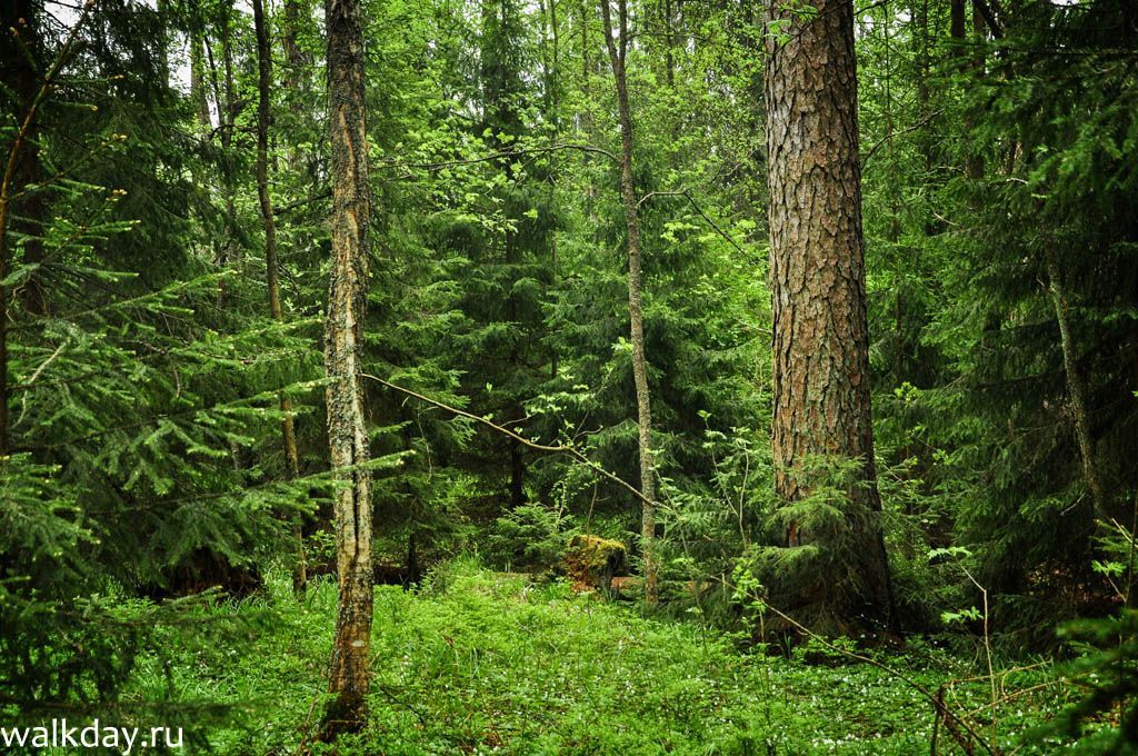Вековые деревья соседствуют с совсем юными побегами своих собратьев. Прямые, как стрела, стволы двухсотлетних лиственниц устремляются вверх, а земля вокруг усеяна опавшей хвоей, зарослями папоротника, ландыша, черники и другими травами. Стволы некоторых деревьев достигают почти метра в диаметре.