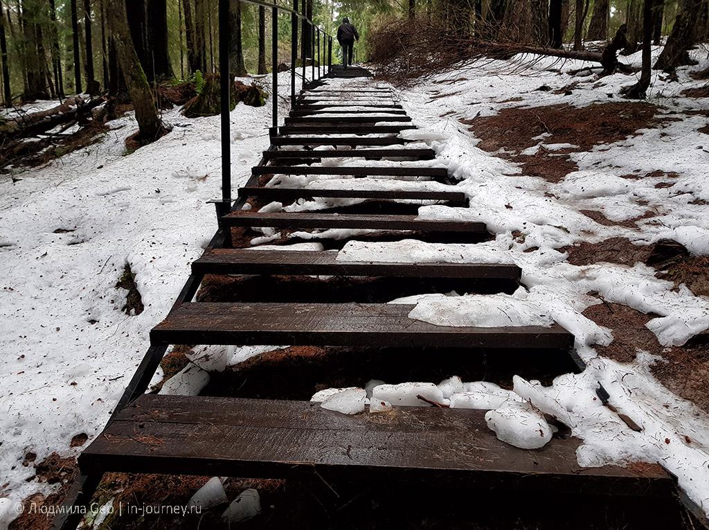 Рядом с экотропой много спусков и подъёмов. Из-за большого наплыва посетителей и смены температур дорожки превратились в каток. Лучше приезжать в обуви с нескользящей подошвой. Но и она не спасёт от падений