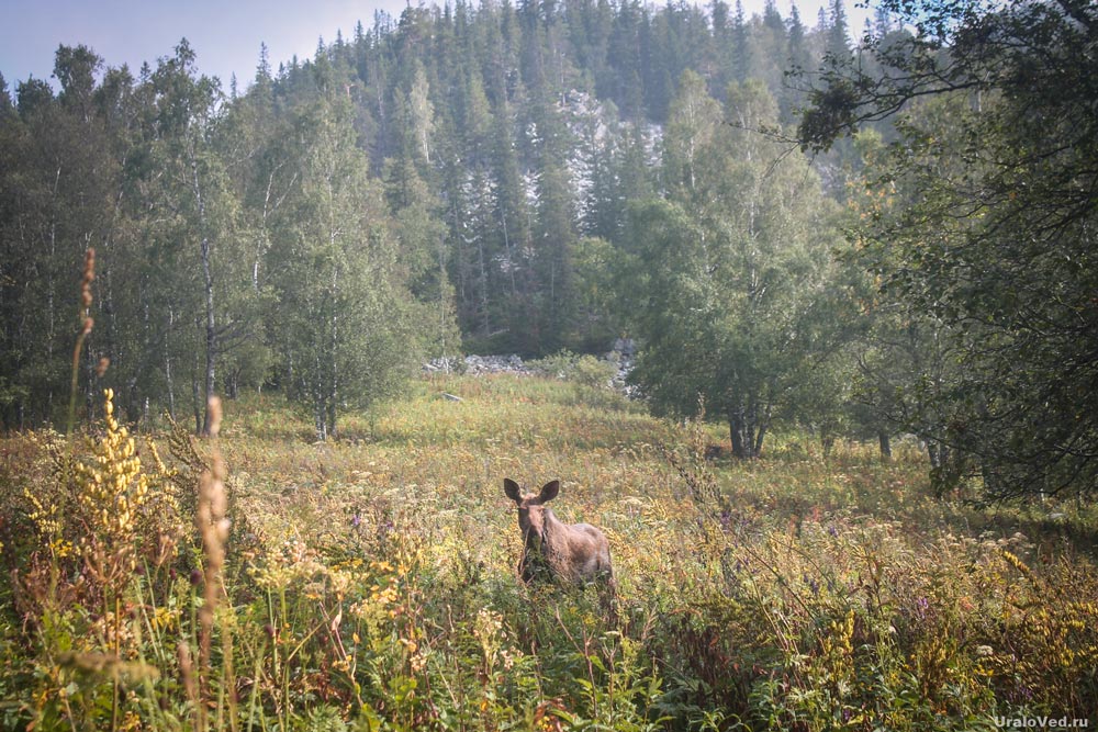 На полянке под вершиной мы встретили лосиху. Лоси тут наполовину ручные, человека не боятся, поскольку выросли на кордоне. Летом они спокойно гуляют по округе.