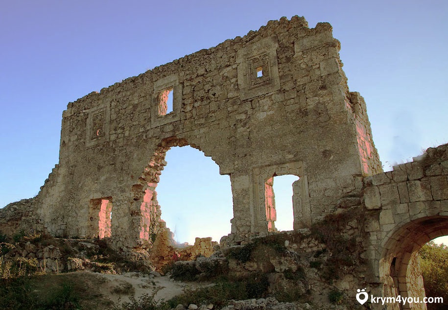 Броский нарядный фасад обвалился в XIX веке, осталась лишь толстая стена с тремя окнами и дверной проем с вырезанными на камне орнаментами. Очевидно рядом, на мысе Тешкли-Бурун, была небольшая княжеская церковь; сохранилась часть ее фундамента. В Крыму это единственный известный храм восьмигранной планировки.