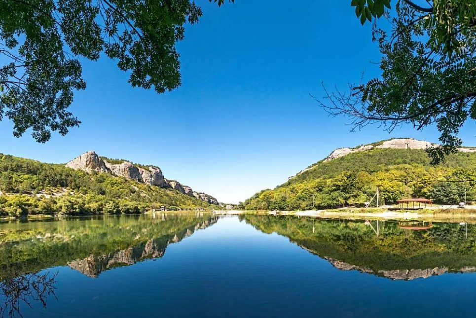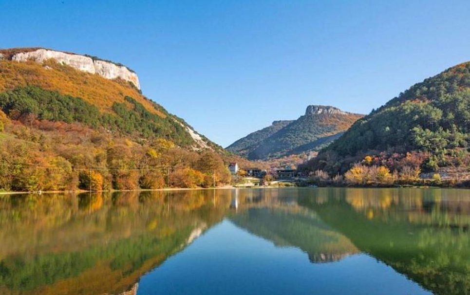 Озеро Мангуп окружают скалы, поросшие хвойными деревьями. Они круглый год защищают водоем от ветров, поэтому его поверхность напоминает зеркало. В его спокойных водах эффектно отражаются горы и леса, позволяя делать запоминающиеся фотоснимки. В лучах заходящего солнца водная гладь напоминает сверкающий драгоценный камень.