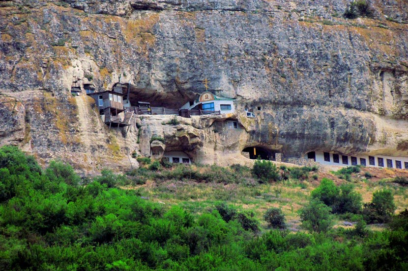 Чуть в стороне от туристического маршрута находится Свято-Благовещенский мужской монастырь в скале. Чтобы выйти к нему, нужно спуститься с плато на 25 м по валунам. Все помещения действующего монастыря располагаются в гротах и пещерах Мангупа, правда, кельи оборудованы современными окнами и дверями.