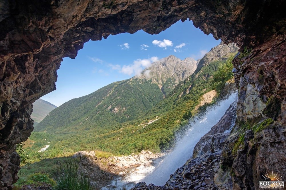 Надо сказать, что средняя «сестра» – наиболее полноводна и красива. Это особенно заметно вблизи величественного каскада. Рядом с ним чувствуется невероятная мощь и сила природы Кавказа. Близ центрального потока спряталась небольшая пещера, откуда чудесно видна окружающая панорама.