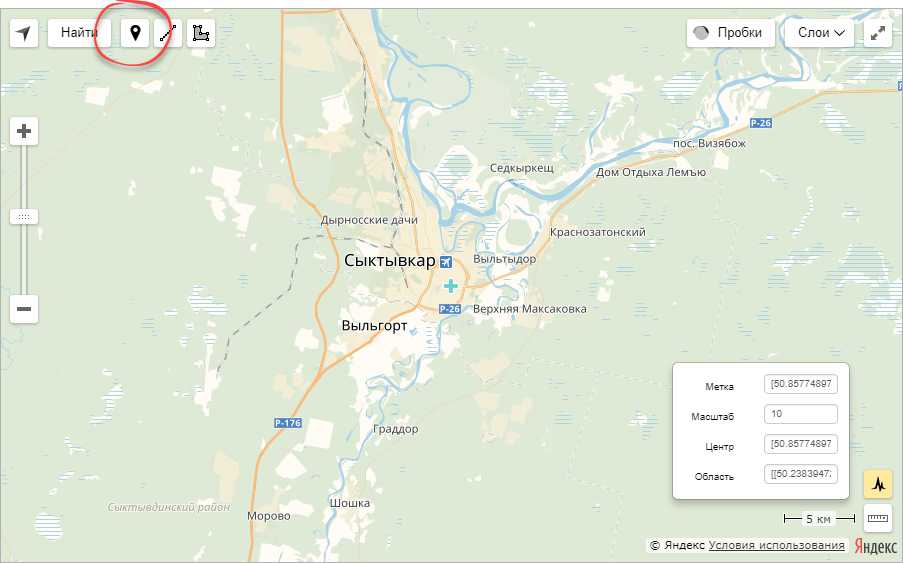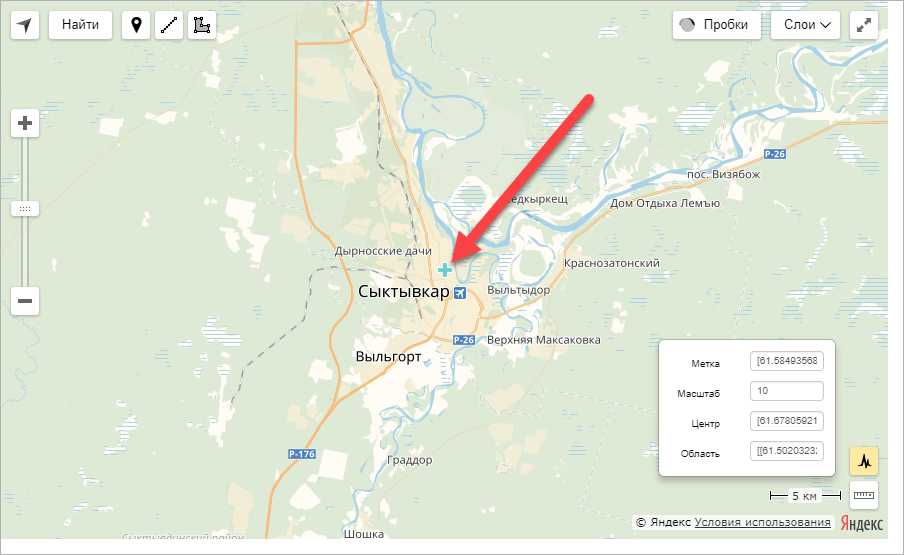 - Для примера мы станем определять координаты города Сыктывкар. Давайте найдем его. Пользоваться данной версией нужно, как и обычной. Прокручиваем местность мышкой, регулируя ее масштаб колесиком, пока не найдем нужный объект. По центру экрана будет голубой маркер, для которого и определяется позиция. Наведите его на искомую точку.